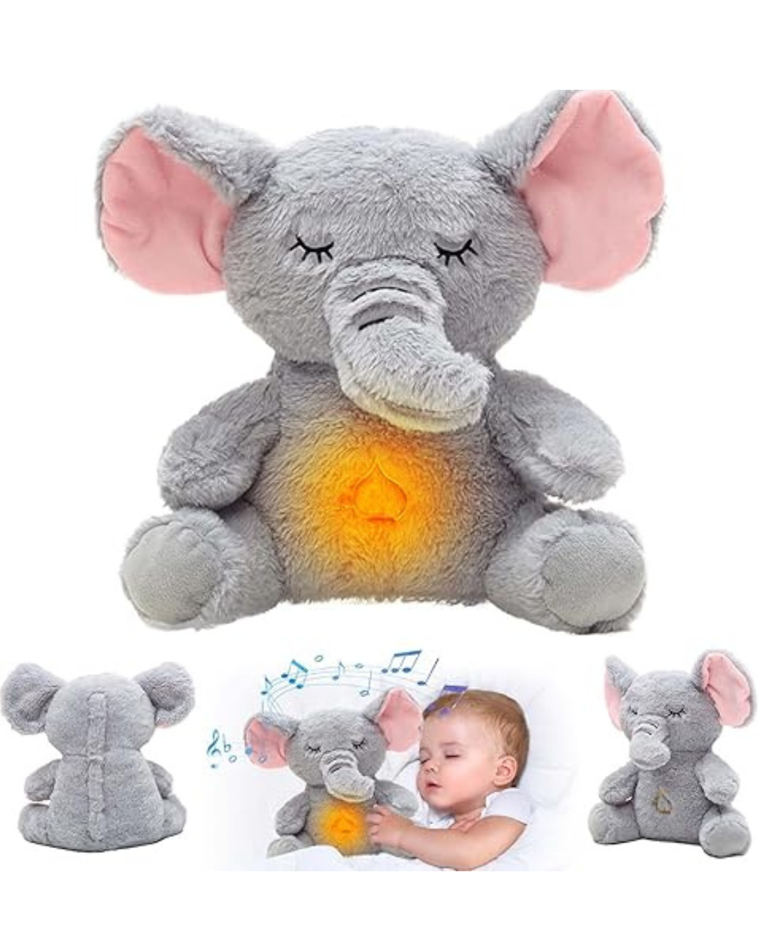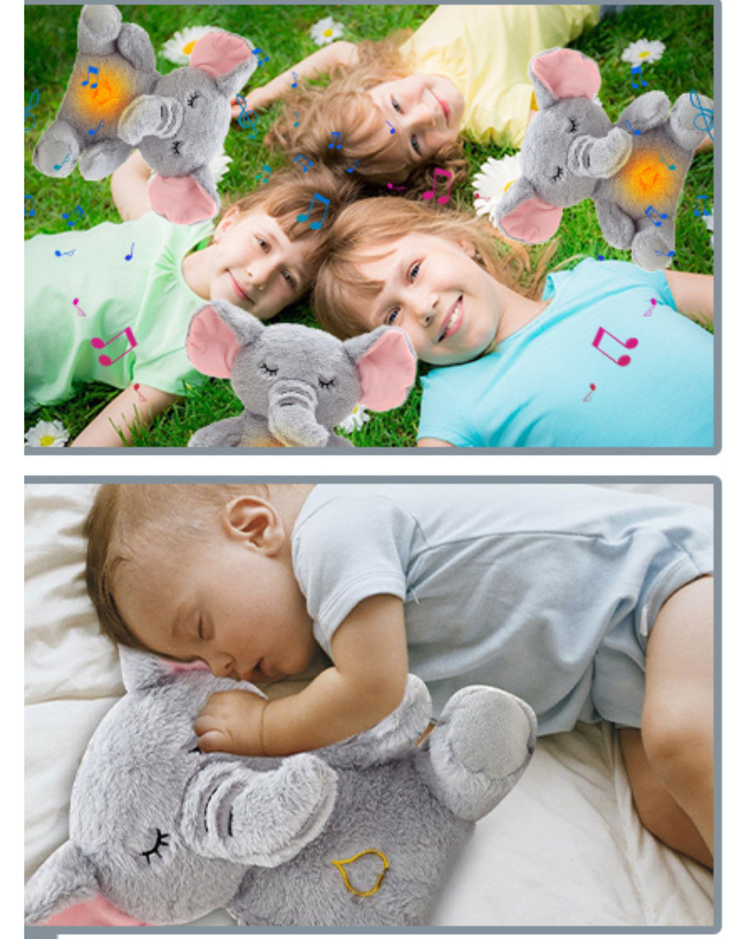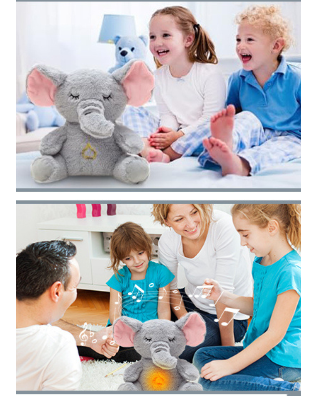 El elefante se mueve suavemente como si respirara, transmitiendo calma y una sensación de compañía natural. Perfecto para bebés que se asustan o duermen inquietos.